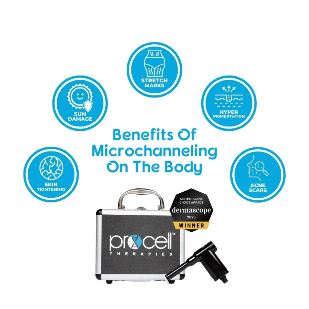 Procell has an extremely short downtime: 60-90 minutes while the microchannels in your skin close. Compared to the 3-5 day recovery period for traditional microneedling, Procell’s microchanneling treatment is the obvious choice for high quality results with minimal downtime.